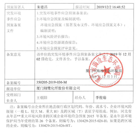 翔鷺化纖突發環境事件應急預案備案表及備案批復
