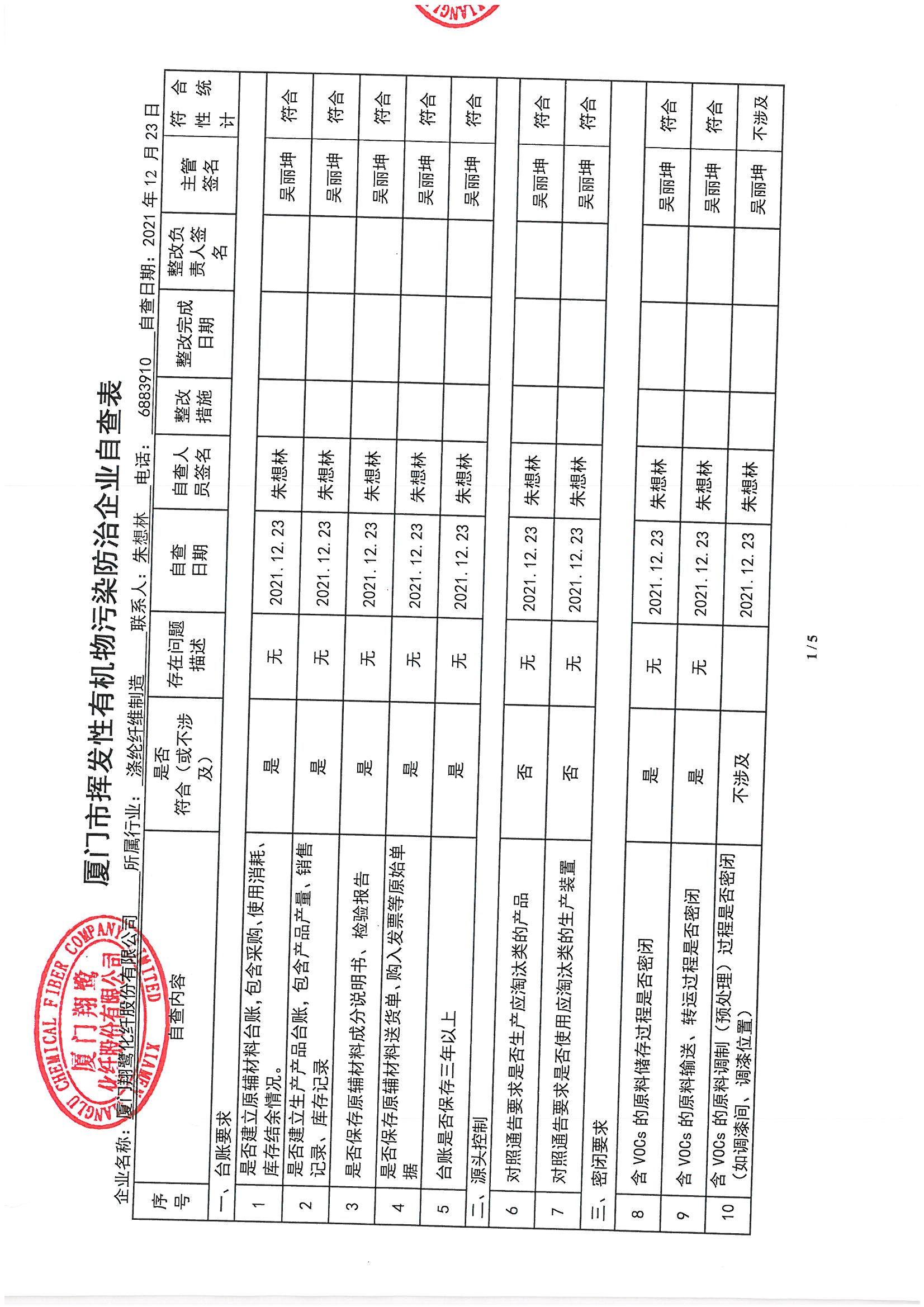 廈門市揮發性有機物污染防治企業自查表 (2021年 第四季度)