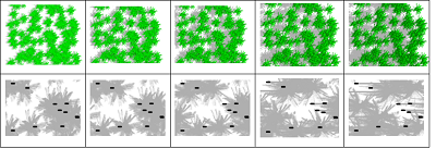 不同太陽(yáng)角度下的冠層陰影(上:相機(jī)在冠層上部看到圖像,相機(jī)高度29米;下:相機(jī)在冠層下部看到圖像,其中黑色部分為樹(shù)干,相機(jī)高度4.5米。)